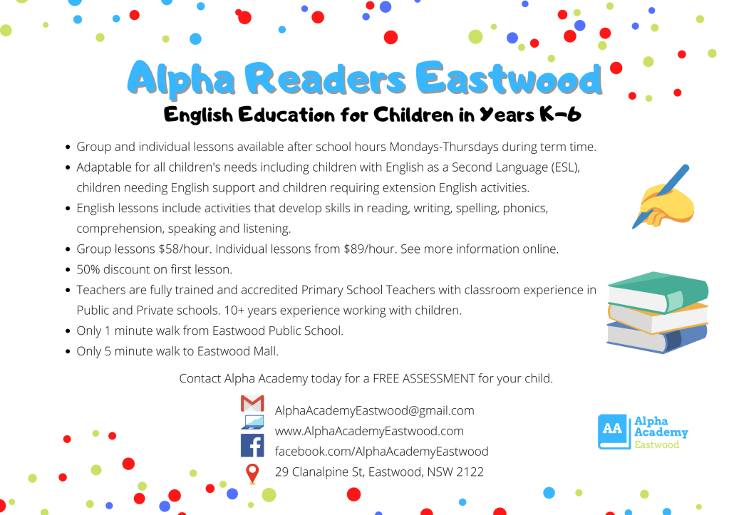 Alpha Readers is an English program run by Alpha Academy Eastwood. Is your child learning English as an additional language? Or do they need some extra support with reading or writing? Alpha Readers is ready to support your child in Years K-6 either in-person or online.